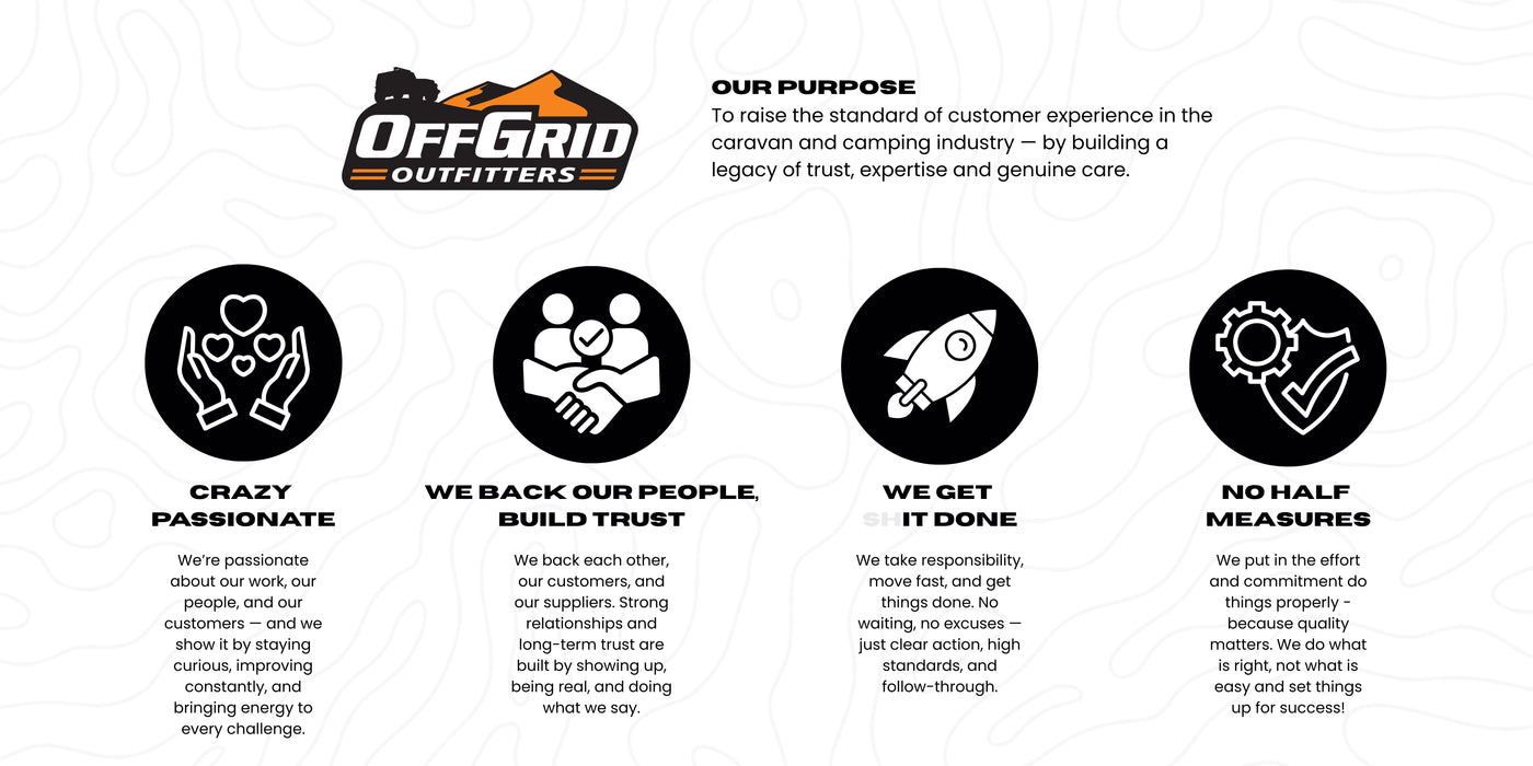 Founded by Ryan Gudiksen and built on a genuine passion for getting off the beaten track, Off Grid Outfitters was created to raise the standard of customer experience in the Australian caravan and camping industry. We sell and service high-quality camper trailers, hybrid campers, and full-size off-road caravans - everything from compact lightweight campers for couples, to large family off-road vans built for remote Australian adventures.